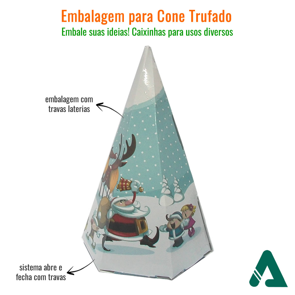 Caixa de Papel cartão 250g impresso com tema Natal e Plastificado com Alto Brilho, Caixa Cone, Embalagem para Páscoa, Amigo Natal, Cone Natal, Embalagem para Cone Trufado, Trufas. Embalagem Cone Natal, Embalagem para Cone Trufado, Balinhas, Festa Surpresa, Brindes, Confraternização, Amigo Secreto, Reveillon, Festas, Truffas. Páscoa Dia das Crianças, Lembrancinhas, Doces.