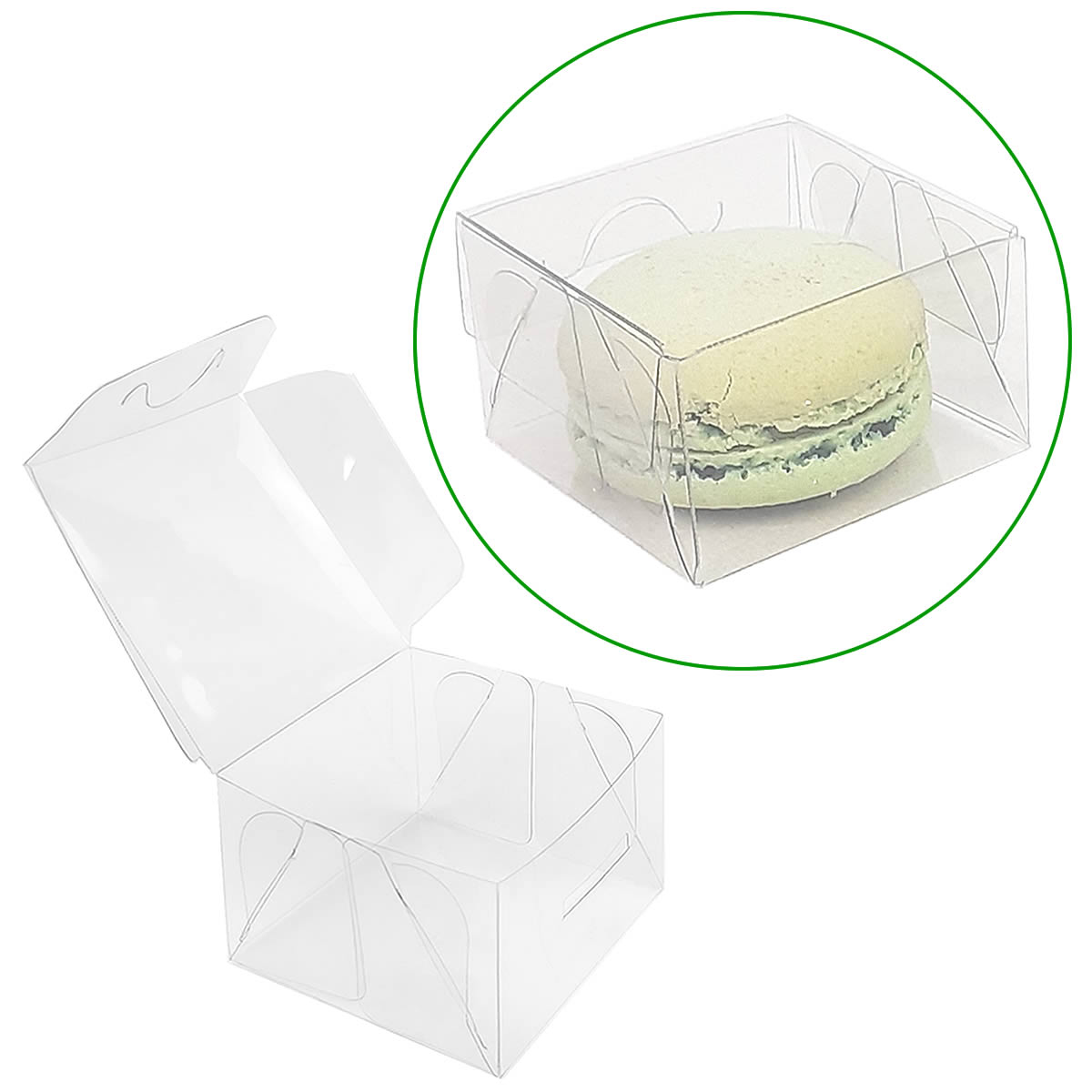 Caixa de acetato transparente PX-206 tamanho 5x5x3 cm, pacote com 500 unidades. Ideal para embalar macarons, bem casados, doces finos e lembrancinhas. Produto de plástico PET resistente, pronto para uso, com envio rápido e qualidade profissional.