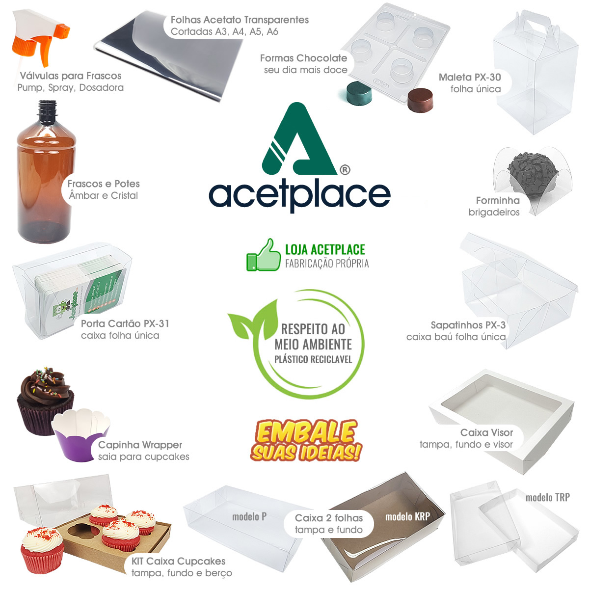 Se você procura embalagens sofisticadas e versáteis, a Acetplace é sua melhor escolha. Nossas caixas de acetato transparente valorizam qualquer produto: doces finos, cupcakes, pães de mel, fatias de bolo, ovos de colher e lembrancinhas para todas as ocasiões.