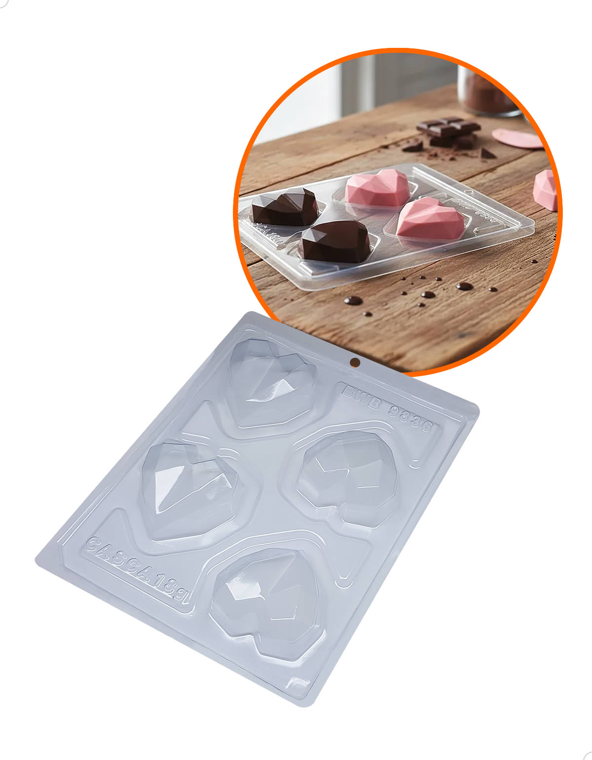 A Forma BWB 9836 Coração Lapidado é uma ferramenta profissional de 3 partes (acetato e silicone) desenvolvida para criar trufas de 65g com design geométrico moderno. É ideal para confeiteiros que buscam padronização, economia de chocolate e um acabamento estético superior para presentes e datas comemorativas. Garante um desmolde fácil e brilho intenso, sendo a escolha número 1 para o nicho de chocolate artesanal de luxo.